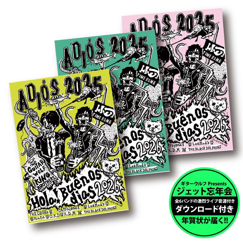 2025年12月29日(月)に難波メレにて開催された狂熱のイベント、ギターウルフ&TIME BOMB presents『ジェット忘年会 2025』のライブ模様(前日神戸にて開催された前夜祭の模様も含む)を収録したギターウルフやキングブラザーズを含む全6バンド収録のライブ音源がダウンロードできるスペシャルな年賀状となります、アートワークはロスマッズ・ミッチ氏が担当、音源の監修はKING BROSが担当し、各アーティスト達の熱狂ライブのハイライト部分が収録されています、年賀状の発送は1月上旬〜中旬頃を予定、Tシャツやスウェット等の発送は約1ヶ月程度の納期で発送いたします【これらの商品は、この日遠方から関西へと駆けつけた若手アーティスト達への移動コスト等の回収を目的とした商品となっております】皆様の応援とご協力を頂けますと幸いです、なお年賀状のカラーはお選び頂けません。