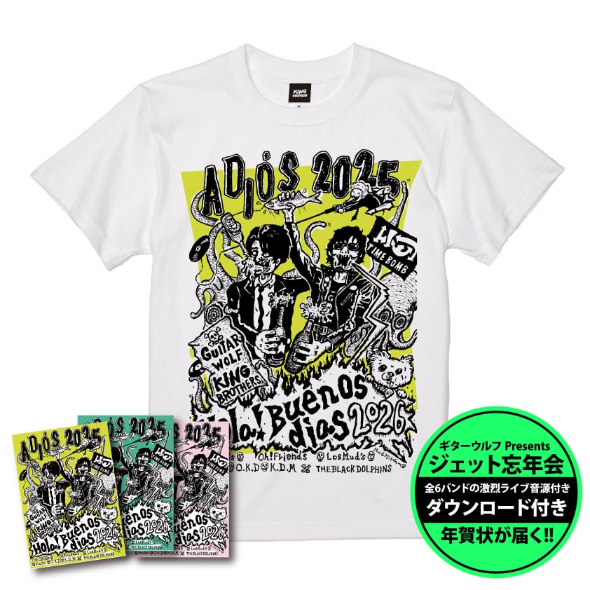 2025年12月29日(月)に難波メレにて開催された狂熱のイベント、ギターウルフ&TIME BOMB presents『ジェット忘年会 2025』のライブ模様(前日神戸にて開催された前夜祭の模様も含む)を収録したギターウルフやキングブラザーズを含む全6バンド収録のライブ音源がダウンロードできるスペシャルな年賀状となります、アートワークはロスマッズ・ミッチ氏が担当、音源の監修はKING BROSが担当し、各アーティスト達の熱狂ライブのハイライト部分が収録されています、年賀状の発送は1月上旬〜中旬頃を予定、Tシャツやスウェット等の発送は約1ヶ月程度の納期で発送いたします【これらの商品は、この日遠方から関西へと駆けつけた若手アーティスト達への移動コスト等の回収を目的とした商品となっております】皆様の応援とご協力を頂けますと幸いです、なお年賀状のカラーはお選び頂けません。