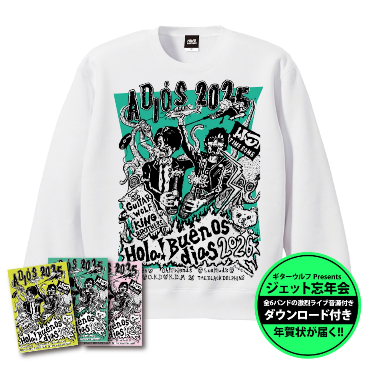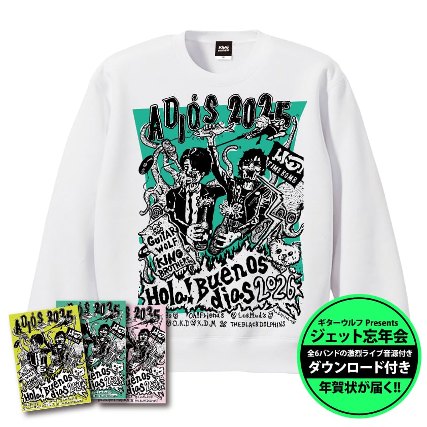 2025年12月29日(月)に難波メレにて開催された狂熱のイベント、ギターウルフ&TIME BOMB presents『ジェット忘年会 2025』のライブ模様(前日神戸にて開催された前夜祭の模様も含む)を収録したギターウルフやキングブラザーズを含む全6バンド収録のライブ音源がダウンロードできるスペシャルな年賀状となります、アートワークはロスマッズ・ミッチ氏が担当、音源の監修はKING BROSが担当し、各アーティスト達の熱狂ライブのハイライト部分が収録されています、年賀状の発送は1月上旬〜中旬頃を予定、Tシャツやスウェット等の発送は約1ヶ月程度の納期で発送いたします【これらの商品は、この日遠方から関西へと駆けつけた若手アーティスト達への移動コスト等の回収を目的とした商品となっております】皆様の応援とご協力を頂けますと幸いです、なお年賀状のカラーはお選び頂けません。