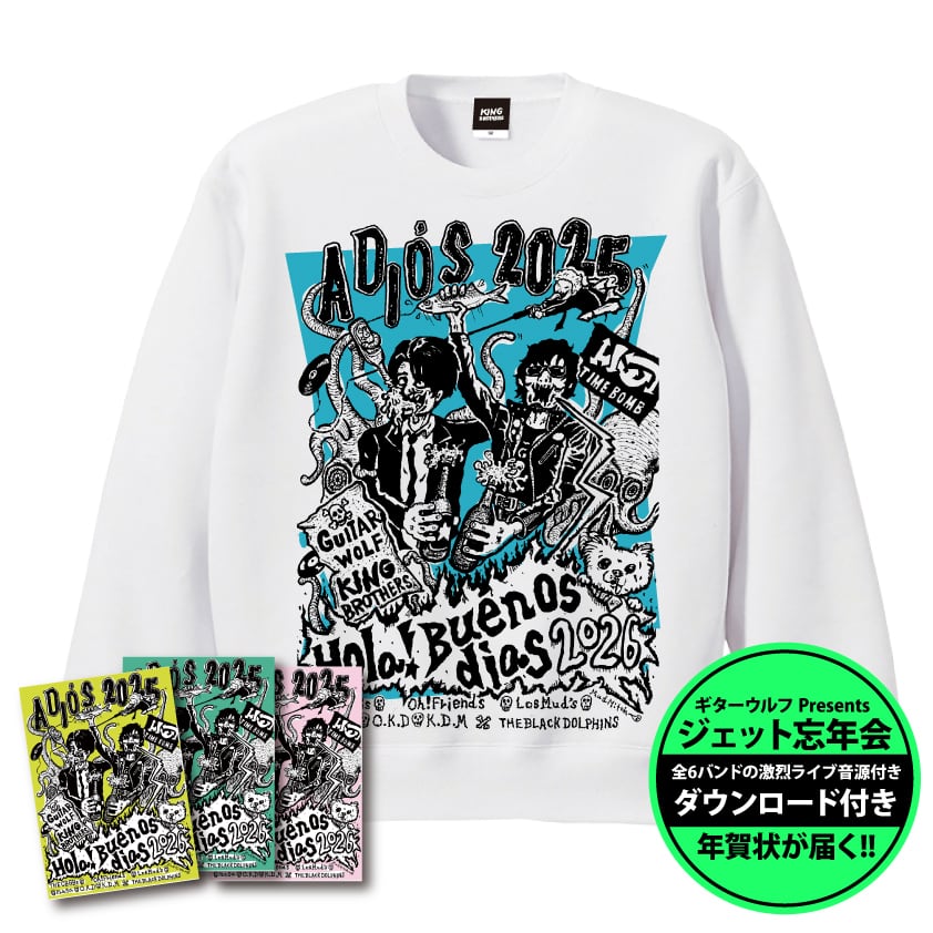 2025年12月29日(月)に難波メレにて開催された狂熱のイベント、ギターウルフ&TIME BOMB presents『ジェット忘年会 2025』のライブ模様(前日神戸にて開催された前夜祭の模様も含む)を収録したギターウルフやキングブラザーズを含む全6バンド収録のライブ音源がダウンロードできるスペシャルな年賀状となります、アートワークはロスマッズ・ミッチ氏が担当、音源の監修はKING BROSが担当し、各アーティスト達の熱狂ライブのハイライト部分が収録されています、年賀状の発送は1月上旬〜中旬頃を予定、Tシャツやスウェット等の発送は約1ヶ月程度の納期で発送いたします【これらの商品は、この日遠方から関西へと駆けつけた若手アーティスト達への移動コスト等の回収を目的とした商品となっております】皆様の応援とご協力を頂けますと幸いです、なお年賀状のカラーはお選び頂けません。